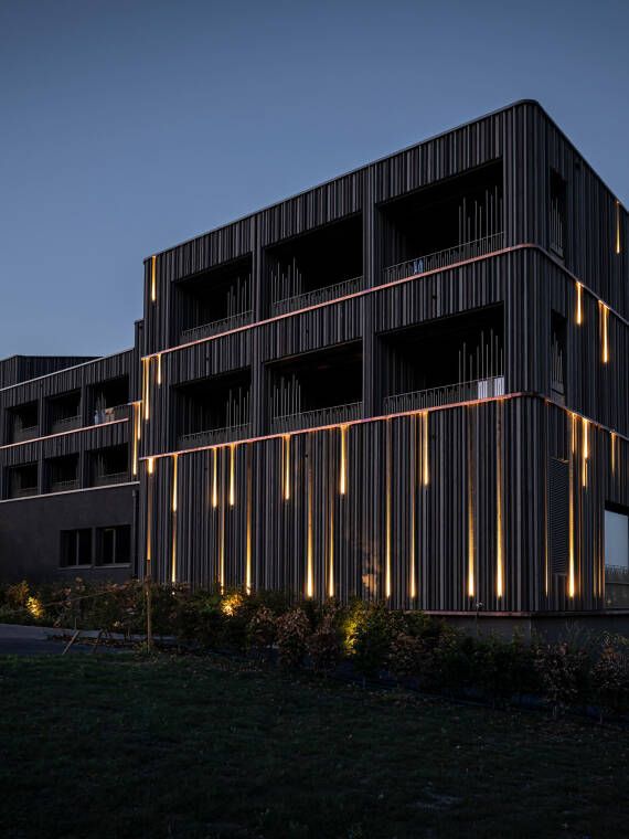 🏗️ 5. Vật liệu facade kết hợp ánh sáng